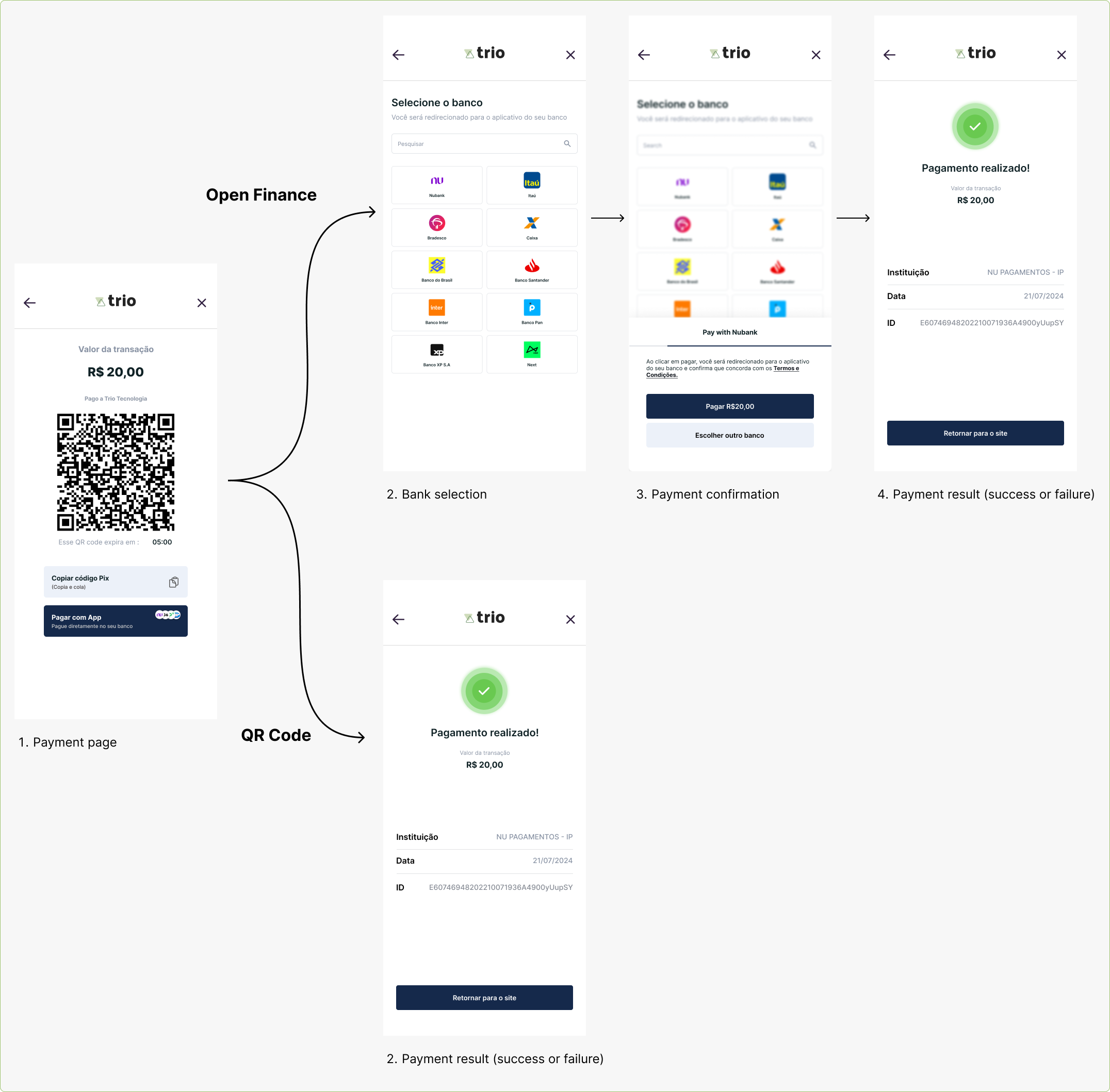 tax_number*: the document/tax number (CPF/CNPJ) that represents the person you intend to receive money from.amount*: Value of the deposit. Always represented in cents.phone_number: Additional information about the person you intend to receive money from.email: Additional information about the person you intend to receive money from.redirect_url: the URL the user will be redirected after completing an open finance transaction. (default will be a Trio confirmation URL)