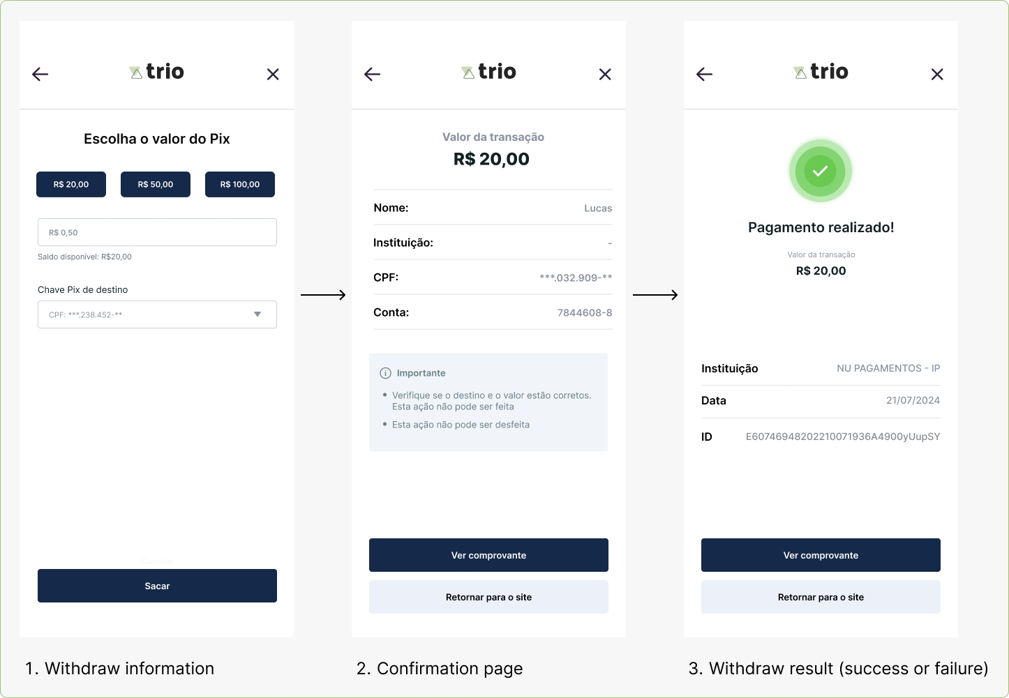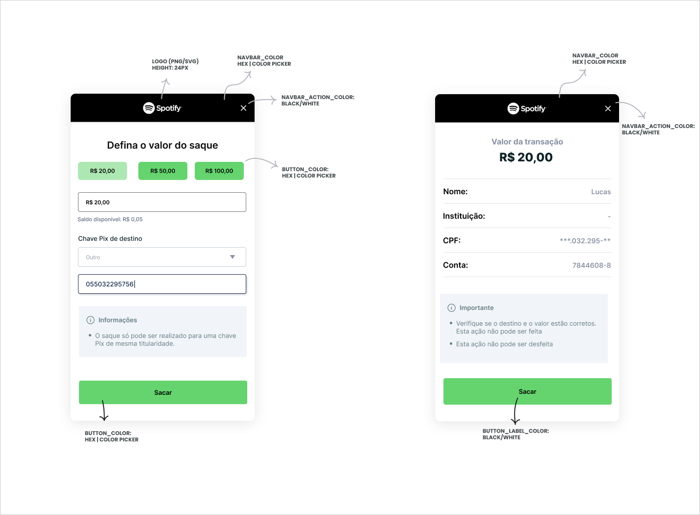 - allow_other_pix_key: boolean value. If true, the Checkout will allow for a Pix Key different from the ones informed in the Session creation to be input. At the Cash-Out step, they will be verified and only successfully paid if the pix key belongs to the tax number initially provided. If not, the payment will fail.